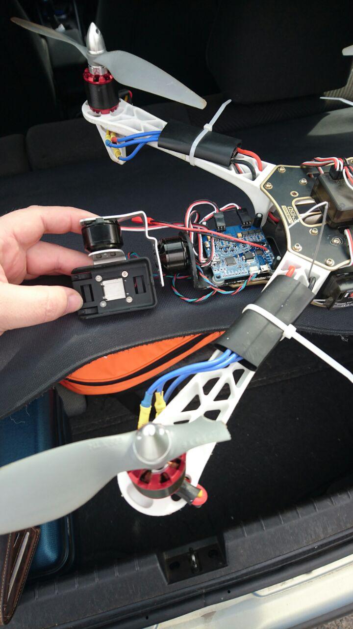 Propeller drauf und den Quadcopter auf's Bett im Schlafzimmer gestellt und scharf gestellt. Die Propeller drehten langsam und ich gab langsam mehr Gas (das muss doch im deutschen besser auszudrücken sein!?). Mein DJI Flamewheel F450 clone hob ab und ich berichtete meinem Kumpel davon. Am gleichen Abend hatte er seinen Quadcopter ebenfalls umgerüstet und der nächste Samstag konnte kommen.